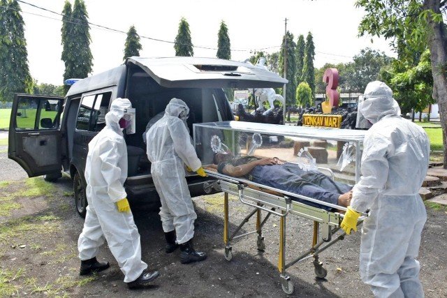SURABAYAONLINE.CO-Dispen Kormar (Surabaya). Prajurit Brigade Infanteri 2 Marinir ikuti latihan evakuasi pasien yang terpapar corona di Kesatrian Marinir Soepraptono Semarung, Ujung, Surabaya. Minggu (26/04/2020).