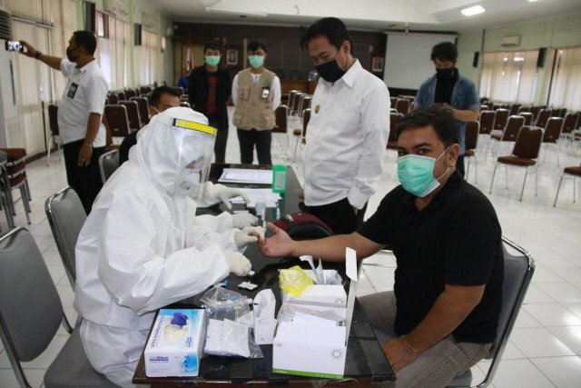 SURABAYAONLINE.CO-Puluhan wartawan yang bertugas melakukan peliputan di lingkungan Pemkab Sidoarjo menjalani rapid test yang digelar Dinas Kesehatan Kabupaten Sidoarjo. Sebanyak 31 orang wartawan yang mengikuti rapid test semuanya menunjukkan hasil negatif Covid-19. Rabu (6/5/2020) di Ruang Delta Graha Kantor Pemkab Sidoarjo.