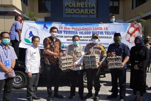SURABAYAONLINE.CO-Plt Bupati Sidoarjo Nur Ahmad Syaifuddin siang ini, jumat 8 Mei 2020 menerima bantuan bahan pangan dari pabrik peternakan ayam PT Charoen Pokphand Indonesia wilayah Sidoarjo berupa 10 ribu butir telur yang diserahkan secara langsung oleh Regional Head Charoen Pokphan Jawa Timur Benyamin Limi di lokasi dapur umum Polres Sidoarjo.