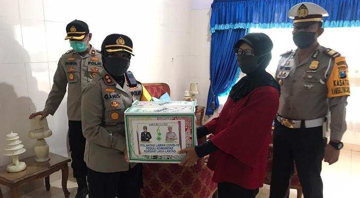 Kapolres Pelabuhan Tanjung Perak AKBP Ganis Setyaningrum didampingi Kasat Lantas AKP Sigit Indra mengatakan, untuk menumbuhkan kepekaan, kepedulian dan solidaritas Polantas serta meringankan kondisi ekonomi para korban laka lantas dimasa pandemi Covid-19, Jajaran Polantas Polda Jatim menginisiasi dan menggerakkan program Polantas Lawan Covid-19.