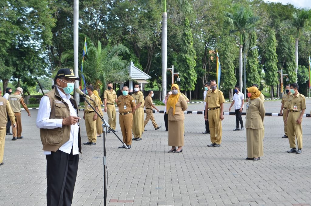 Bupati didampingi Wakil Bupati Dr. Mohammad Qosim dan Pj Sekda Nadlif serta beberapa Kepala OPD menyatakan bangga, karena apel perdana kali ini dihadiri karyawan dari 7 OPD dan semuanya tertib menggunakan masker serta melaksanakan phisikal distancing.