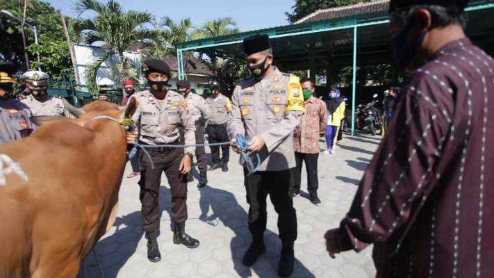 SURABAYAONLINE.CO- Kapolres Blitar Kota AKBP.Leonard M Sinambela SH.S.IK.MH serahkan 5 ekor sapi pada Kamis pagi (30/07/2020), didampingi Waka Kompol Nurhalim dan seluruh PJU Polres Blitar di Masjid Agung Kota Blitar dan Ponpes Bustanul Muta’Alimin Kauman Kec.Kepanjenkidul kota Blitar.