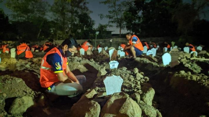 SURABAYAONLINE.CO-Sejumlah 54 orang pelanggar protokol kesehatan di Sidoarjo, Jumat (5/8/2020) malam, duduk bersimpuh satu orang di satu makam korban Covid-19 di Delta Praloyo. Sambil mengenakan rompi oranye bertuliskan pelanggar protokol kesehatan, secara bersamaan mereka membacakan tahlil dan doa bersama.