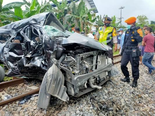 ” Dari beberapa saksi, bahwa alarm di perlintasan kereta api tanpa palang pintu itu sudah meraung raung (berbunyi) bahkan pemgemudi mobil diteriaki oleh warga sekitar, rupanya pengemudi yang bernama Suliyono dari arah Timur menyeberang perlintasan rel kereta api menuju arah ke Barat, tidak mendengar atau kurang perhatian situasi, akhirnya terjadilah benturan tersebut, betul pengemudi atas nama Suliyono meninggal di TKP,” terang AKP.Rudi Hermanto seijin Kapolres AKBP.Ahmad Fanani Eko Prasetya S.IK.