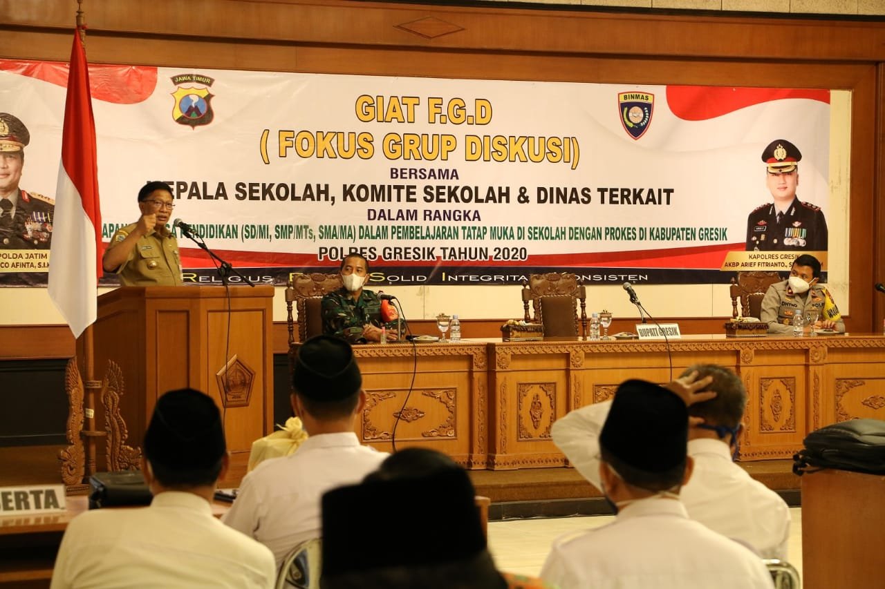 Saat membuka Forum Grup Diskusi (FGD) di Ruang Mandala Bakti Praja Kantor Bupati Gresik lantai IV, Selasa (24/11), Bupati Sambari bertekad tetap memulai pendidikan tatap muka pada awal semester Januari 2021.