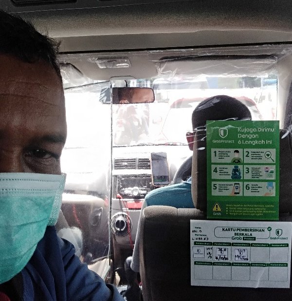 DI dalam kabin, kursi pengemudi terpisah. Pengemudi diselubungi semacam plastik, sehingga tidak ada kontak dengan penumpang. Inilah yang membuat aman dari penularan Covid 19 apalagi penumpang dan pengemudi juga menggunakan masker.
