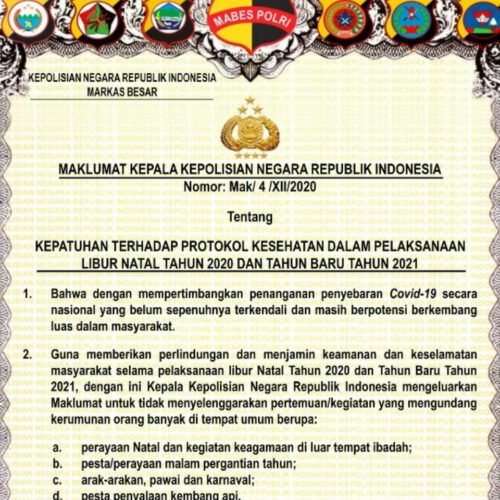 surabayaonline.co- Kapolri Jenderal Idham Azis menerbitkan Maklumat bernomor Mak/ 4 /XII/2020 tentang Kepatuhan Terhadap Protokol Kesehatan Dalam Pelaksanaan Libur Natal Tahun 2020 dan Tahun Baru 2021, tanggal 23 Desember 2020.