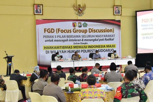 SURABAYAONLINE.CO-Bahaya intoleran dan penyebaran kelompok radikal di Indonesia, harus ditangkal oleh kuatnya sinergitas serta peranan Tiga Pilar di seluruh wilayah. Guna membahas berbagai upaya yang dilakukan, Selasa (29/12/2020) sore, berlangsung Focus Group Discussion) melibatkan tiga pilar dan masyarakat di Kabupaten Sidoarjo.