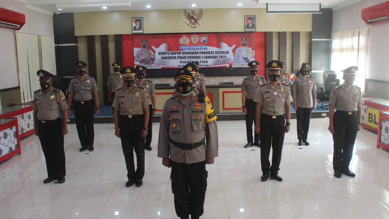 SURABAYAONLINE.CO-.Upacara Korps Raport Kenaikan Pangkat Setingkat Lebih Tinggi kepada 104 anggota Polres Blitar pada, Rabu (6/1/2021) di gelar di gedung Rupatama Polres Blitar.