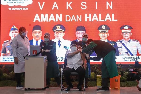 SURABAYAONLINE.CO-Pj Bupati Sidoarjo Hudiyono orang pertama yang menerima suntikan vaksin covid- 19 , disusul Kapolresta, Dandim dan selanjutnya. Sebanyak 17 nama pejabat pemkab sudah masuk daftar penerima suntikan vaksin, Jum ‘at ( 15/1/2021) di Rumah sakit Umum Daerah (RSUD)Kabupaten Sidoarjo .
