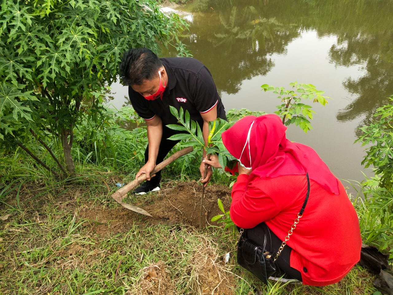 Mereka menanam 200 bibit pohon lindung, terdiri dari pohon sukun, mangga, alpukat dan mahoni, di Waduk Dusun Randu Songo, Desa Kesamben Kulon Kecamatan Wringinanom, Sabtu (23/1).