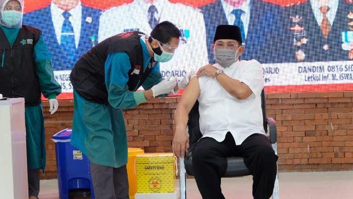 SURABAYAONLINE.CO-Pelaksanaan vaksinasi tahap dua di kabupaten Sidoarjo berjalan lancar dan suasana terlihat lebih tenang dan santai. Ini terlihat dari wajah mereka mulai dari para pejabat forkopimda yang hadir dan para tenaga kesehatan (nakes) tim vaksinasi covid-19 yang bertugas menyuntik vaksin ke para pejabat teras Sidoarjo. Jum’at (29/1/2021) di Gedung Hemodialisa RSUD Sidoarjo.