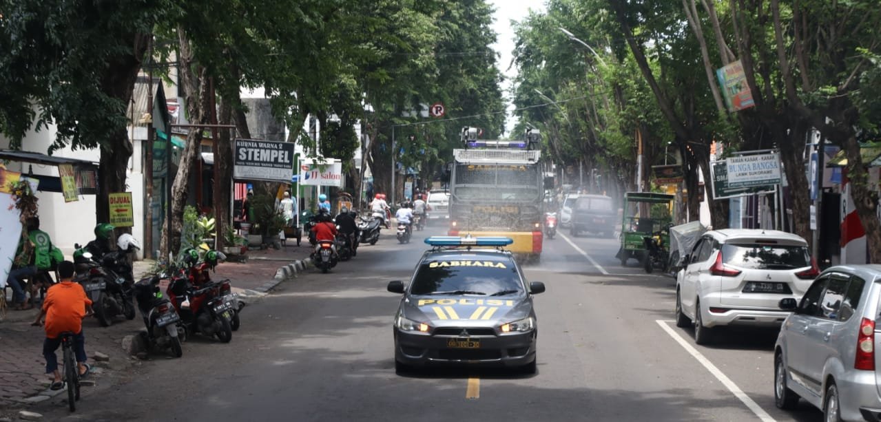 SIRABAYAONLINE.CO, GRESIK –Dengan menggunakan satu unit mobil Water Canon Sat Sabhara Polres Gresik melakukan aksi penyemprotan cairan disifektan di sepanjang Jalan Gubernur Suryo- Jl.Ahmad Yani- Jl.Usman Sadar- Jl.Kh.Wachid Hasyim Kota Gresik.