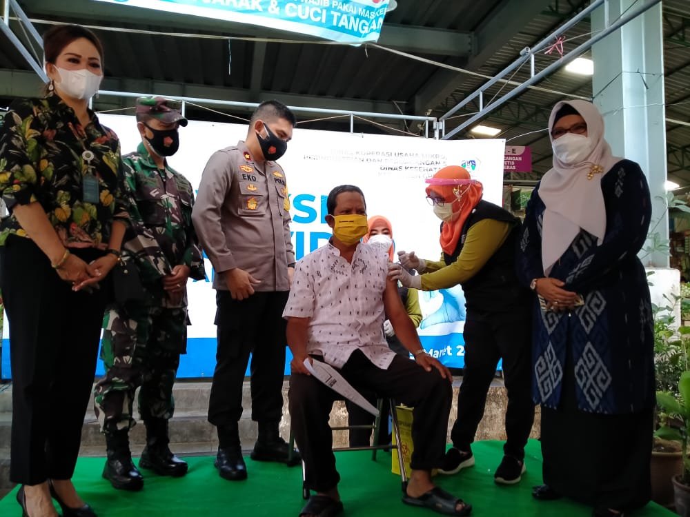 “Alhamdulillah hari ini kami bersama Dinkes, bisa melaksanakan vaksinasi untuk pedagang pasar,” ujar Bu Min.