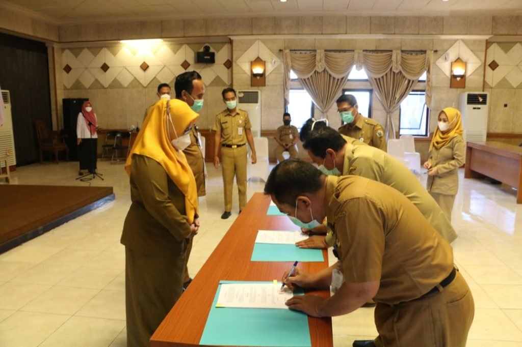 Sebelum dilaksanakan, Dinas Kependudukan dan Catatan Sipil (Dispendukcapil) dengan Dinas Kesehatan menandatangani MoU di ruang Mandala Bhakti Praja kantor Bupati Gresik, Senin (22/3).
