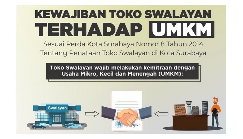 Toko swalayan mewajibkan melakukan kemitraan dengan Usaha Mikro Kecil dan Menengah (UMKM). Bentuk kemitraan itu berupa penyediaan lokasi usaha secara gratis, dengan melakukan kerjasama pemasaran, penyediaan pasukan produk.