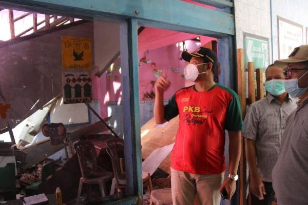 Wabup Abah Subandi mengecek langsung kondisi sekolah TK yang sehari-hari dipakai belajar mengajar puluhan siswa yang berasal dari desa Bakalan Wringinpitu tersebut. Minggu, (28/3/2021).