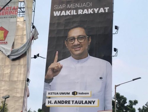 Di papan reklame paling atas, sebuah tulisan besar yang ditulis di papan tersebut, “Siap Menjadi Wakil Rakyat.”, kemudian dibawahnya tertulis, Ketua Umum Kabain, H. Andre Taulany.”