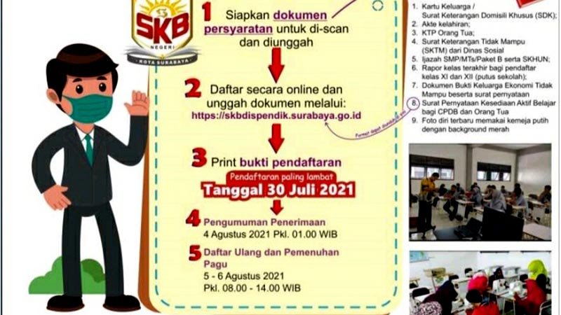 Pemkab Surabaya melalui Dinas Pendidikan Kota Surabaya saat ini menggelar Penerimaan Peserta Didik Baru SKB untuk Program Kejar Paket C, dengan ijazah setara SMA “Sanggar Kegiatan Belakar Negeri Kota Surabaya.