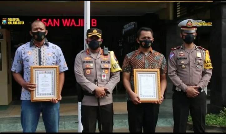 SURABAYAONLINE.CO, Malang (Jatim) – Dalam rangka memberikan himbauan pada masyarakat kota pada bahaya covid 19 Satlantas Polresta Malang kota menggelar lomba video dan poster yang diikuti oleh masyarakat umum dari giat tersebut ada 2 orang pemenang yang hari ini menerima hadiah dan diserahkan langsung oleh kapolresta Malang dihalaman Mapolresta saat apel tadi pagi
