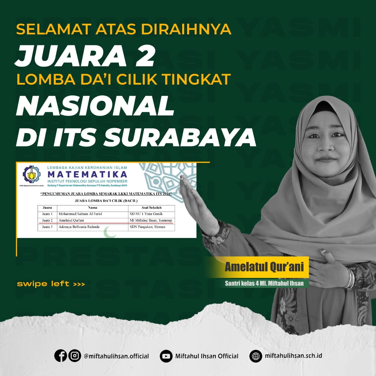 “Untuk juara dua Da’i Cilik, yaitu Amelatul Qur’ani dari MI Miftahul Ihsan Sumenep,” kata panitia saat mengumumkan juara Dacil ITS 2021 yang disambut sorak sorai para pendukung gadis cilik yang akrab disapa Amel itu.