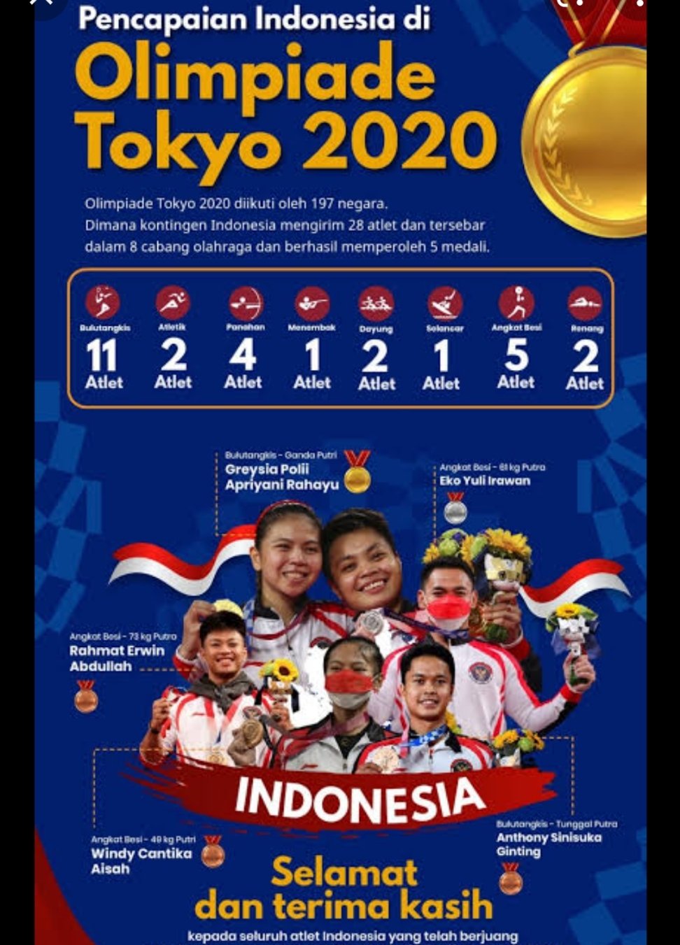 Olimpiade Tokyo 2020 telah usai digelar di tengah keterbatasan akibat pandemi. Indonesia berhasil membawa pulang 5 medali, di antaranya adalah perunggu yang diraih Windy Cantika Aisah dari cabor angkat besi. Semangat berolahraga dan berprestasi yang diusung perhelatan internasional ini, diharapkan dapat menyuntikkan harapan dan optimisme bagi masyarakat, untuk tidak berhenti berkarya sambil tetap disiplin memelihara protokol kesehatan.