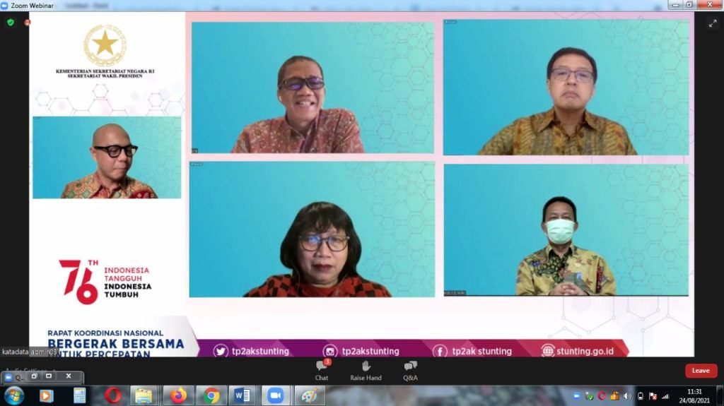 Sebelumnya, kegiatan Rakornas Percepatan Penurunan Stunting dibuka secara resmi oleh Wakil Presiden RI, KH. Makruf Amin yang juga menyampaikan arahan kepada segenap peserta yang terdiri dari unsur pemerintah daerah, kementrian terkait dan para pemangku kepentingan lainnya. Dalam pengarahannya, Wakil Presiden RI mengingatkan peserta bahwa tantangan percepatan penurunan stunting saat ini adalah bagaimana memastikan semua program yang sudah direncanakan dapat dirasakan langsung oleh masyarakat. Oleh karena itu perlu kerja kolaborasi yang melibatkan pemerintah, komunitas, dunia bisnis, akademisi dan media massa. Pengarahan kemudian percepatan penanganan stunting kemudian diteruskan oleh para menteri, diantaranya Menteri BPN/Bappenas, Menteri Kesehatan, Menteri Dalam Negeri, Menteri Keuangan, Menko PMK, dan Menteri Desa-PDTT dan Kepala BKKBN. (Yuris)