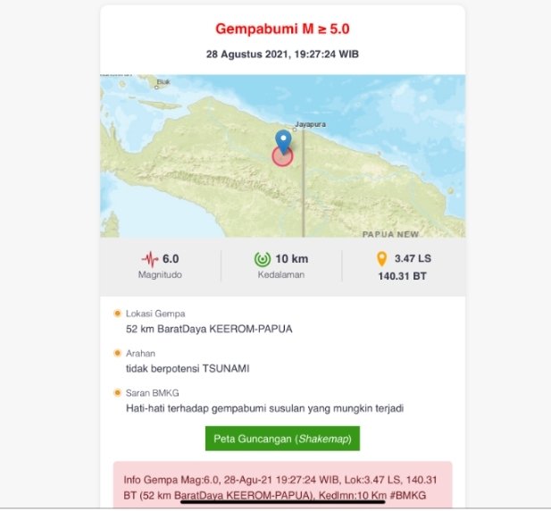 SURABAYAONLINE.CO – Gempa bumi berkekuatan 6.0 skala richter (SR) mengguncang Kota Jayapura, Provinsi Papua, Sabtu (28/8/2021) malam. Pusat gempa yang terjadi sekira pukul 21.27 WIT atau 19.27 WIB itu diketahui berada di wilayah Kabupaten Keerom, berjarak sekitar 121 km dari Kota Jayapura.