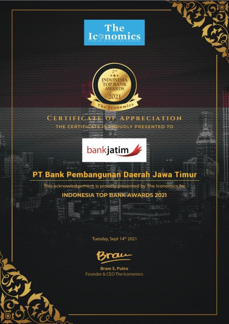 Bank Jatim menyikapi pandemi ini sebagai sebuah tantangan dan peluang untuk terus tumbuh dan berkembang, serta memberikan stimulan positif terhadap perekonomian di Indonesia. Hal tersebut menjadi dasar bagi The Iconomics Research and Consulting dalam menetapkan bankjatim sebagai Penerima Penghargaan Indonesia Top Bank Awards 2021 kategori Bank Buku 3.