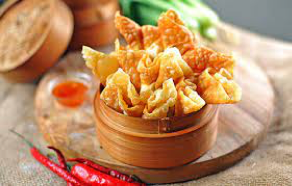 – Siapkan kulit pangsit dan isi dengan ayam lalu bentuk dan rekatkan  menggunakan air putih.