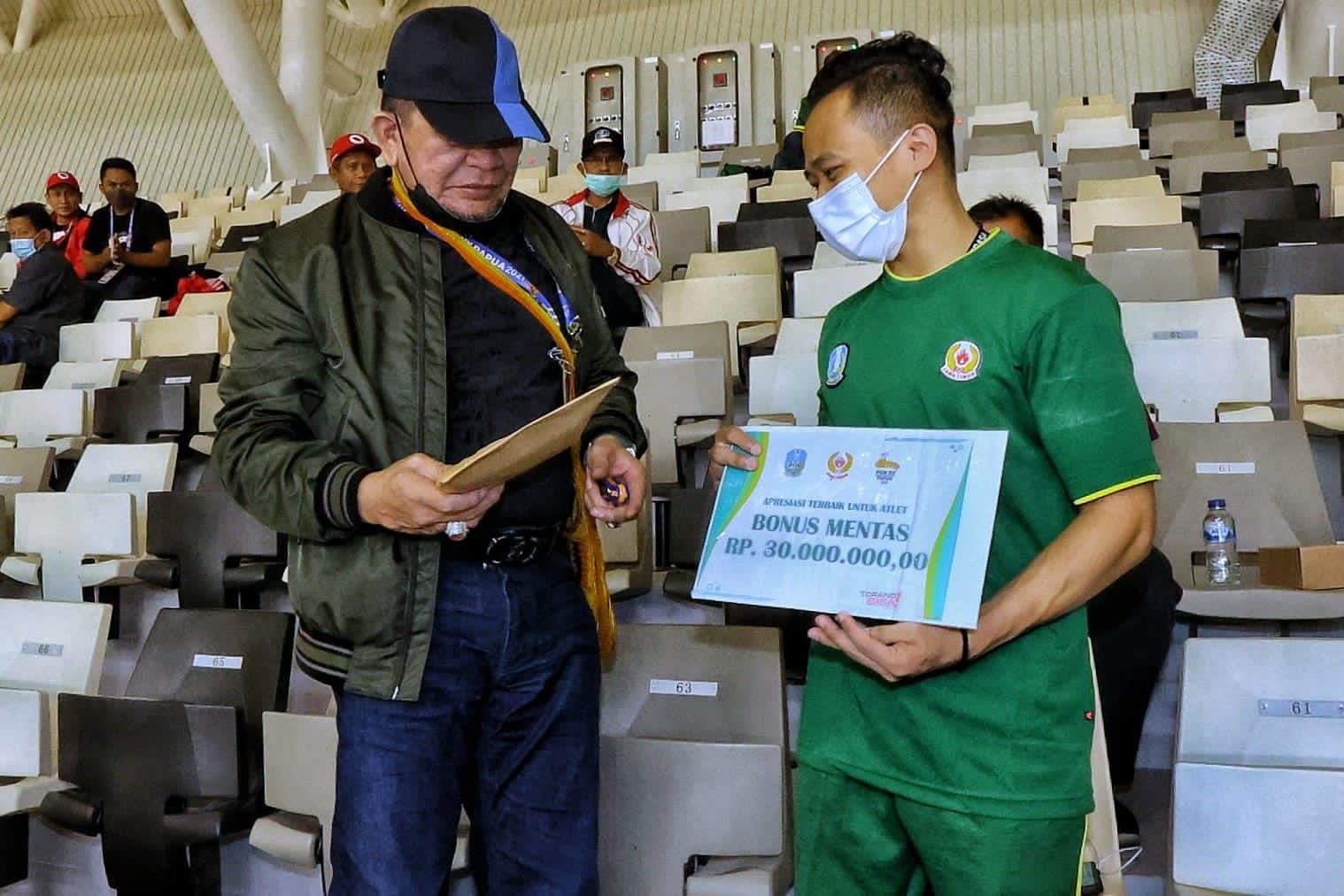 Di tempat terpisah, KONI Jatim juga langsung memberikan bonus mentas uang ke atlet peraih medali emas asal Jatim sebesar Rp 30 juta. Bonus tersebut secara langsung diserahkan oleh LaNyalla yang juga sebagai Ketua Dewan Penyantun KONI Jatim. Dua pesenam yang meraih bonus adalah Agus Adi Prayoko dan Jelena Sandra.
