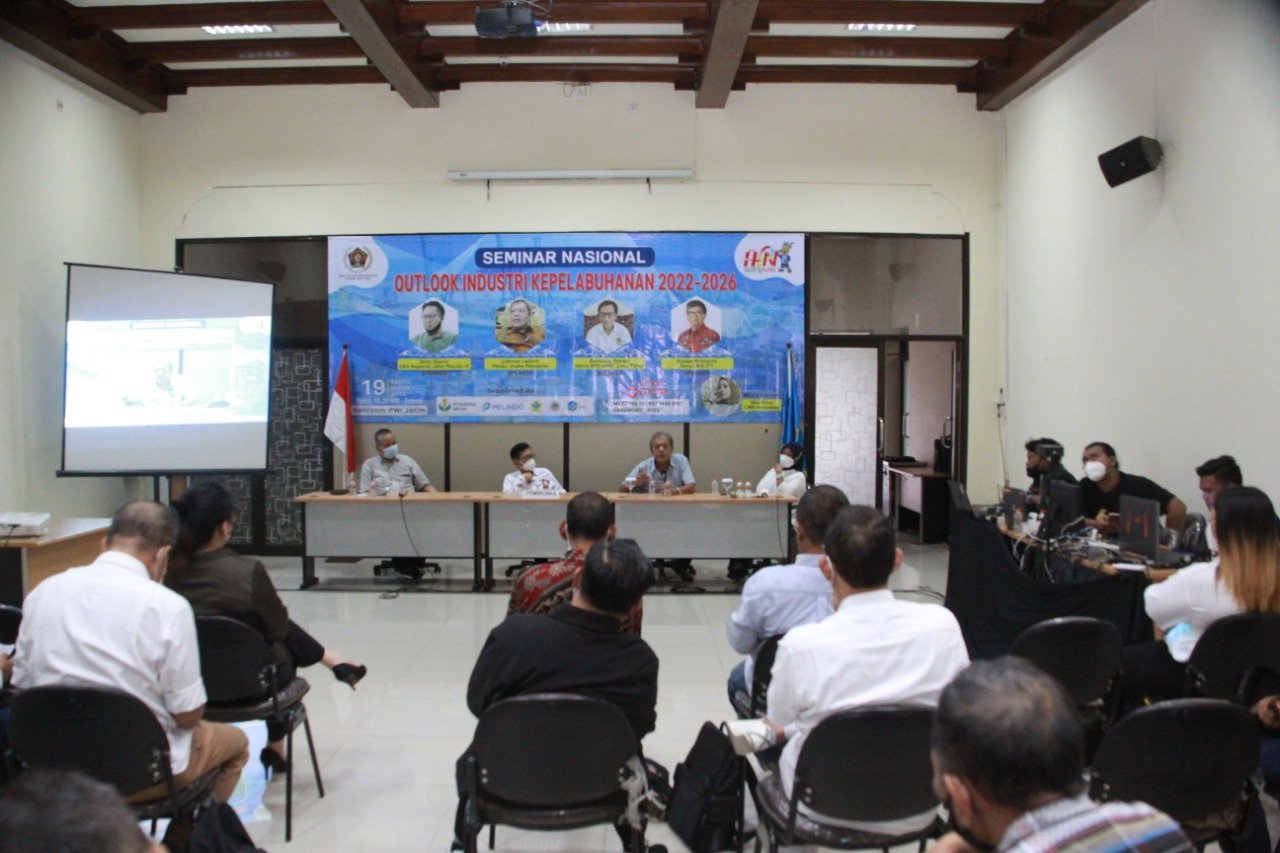 Hal ini terungkap dalam seminar nasional yang digelar secara hibrida, “Outlook Industri Kepelabuhanan 2022-2026” yang digelar Seksi Wartawan Kepelabuhanan dan Kemaritiman PWI Jatim, Sabtu, 19 Maret 2022, di Ballroom PWI Jatim, Jalan Taman Apsari 15-17, Surabaya.