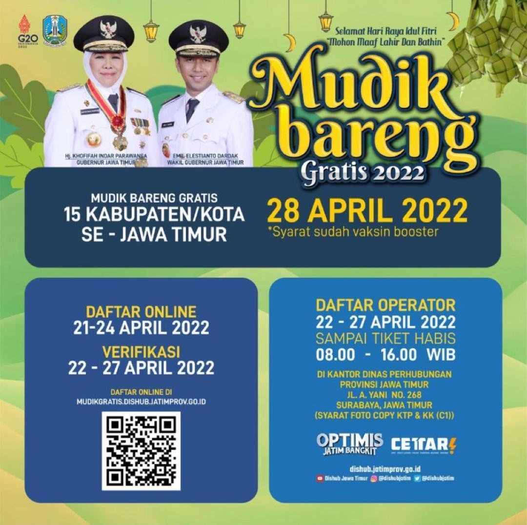 Lebih lanjut, program Mudik Bareng Gratis tahun 2022 akan dilaksanakan tanggal 28 April 2022 mendatang. Program ini memfasilitasi mudik ke 15 kabupaten kota tujuan Se Jawa Timur.
