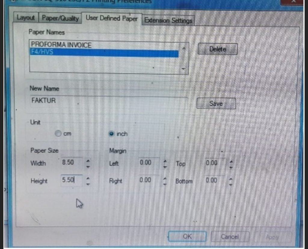 4. Save ukuran kertas yang telah kamu setting dan anda bisa menggunakan ukuran kertas tersebut pada saat catak faktur.