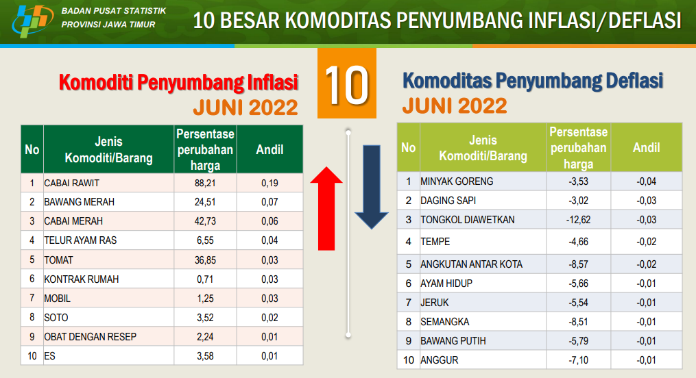 SURABAYAONLINE.CO – Sepuluh komoditas penyumbang deflasi di Jawa Timur pada bulan Juni 2022 antara lain minyak goreng, daging sapi, tongkol diawetkan, tempe, angkutan antar kota, ayam hidup, jeruk, semangka, bawang putih, dan anggur.