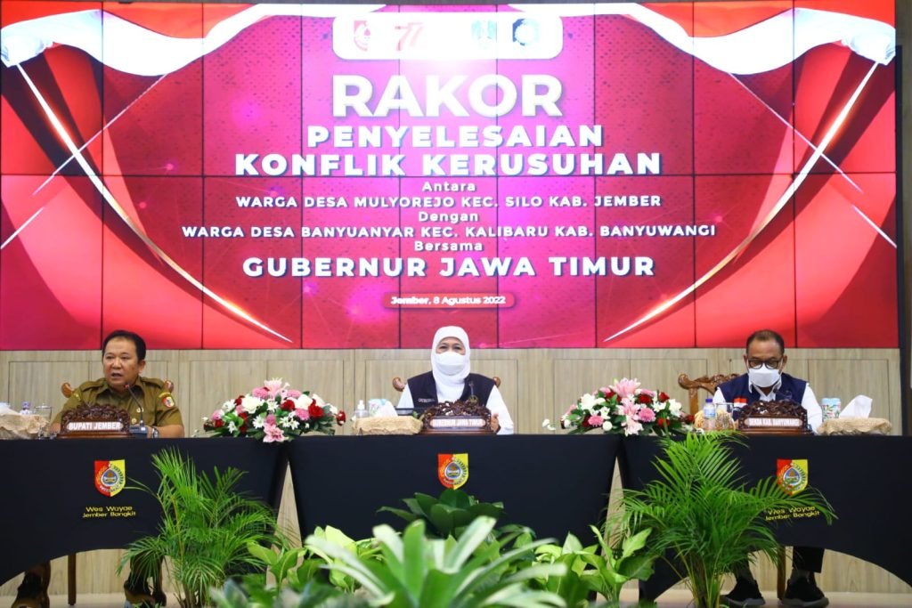 Secara khusus, Gubernur Khofifah telah menggelar Rakor Penyelesaian Konflik Kerusuhan antara warga Desa Mulyorejo Kec. Silo Kab. Jember dengan warga Desa Banyuanyar Kec. Kalibaru Kab. Banyuwangi di Pendopo Kab. Jember, Senin (8/8).