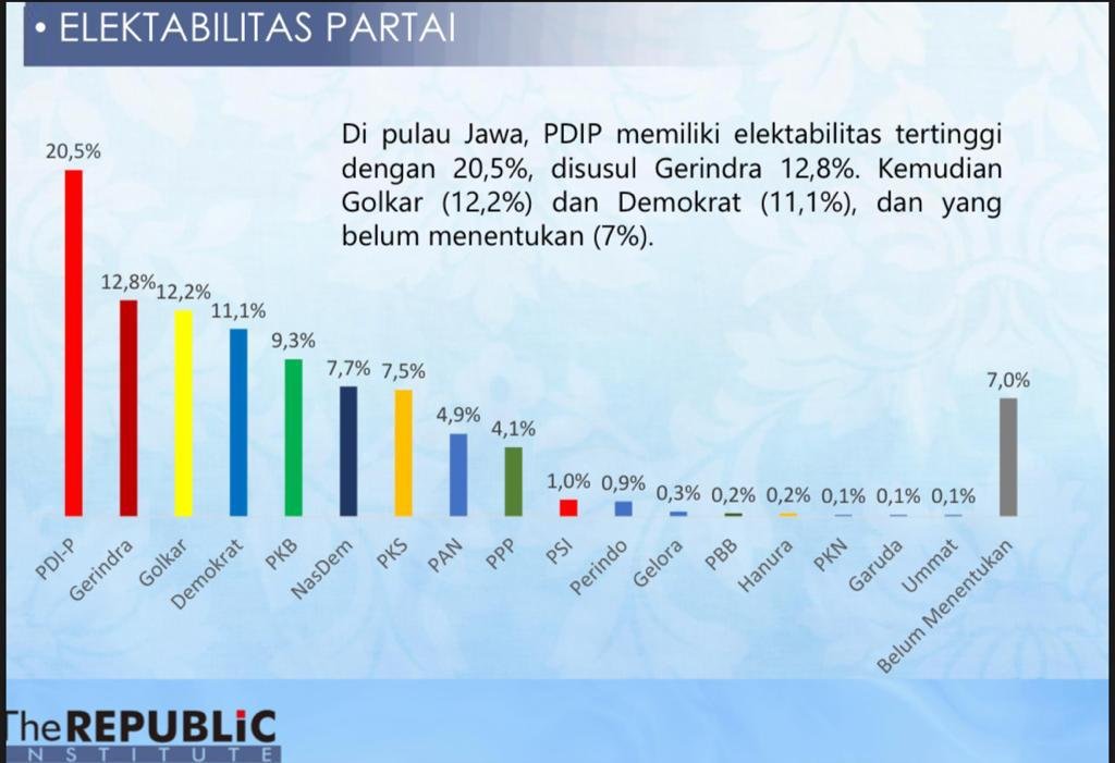 Sementara itu untuk tingkat keterpilihannya (elektabilitasnya) masyarakat menempatkan pilihannya sebagai berikut: PDI-P (20,5%), Gerindra (12,8%), Golkar (12,2%), Demokrat (11,1%), PKB (9,3%), Nasdem (7,7%), PKS (7,5%), PAN (4,9%), PPP (4,1%), PSI (1,0%), dan Perindo (0,9%). Sedangkan terdapat beberapa partai dibawah angka 0,5% seperti Gelora, Hanura, PBB, PKN, dan Ummat. Sedangkan angka belum menentukan sebesar 7%.