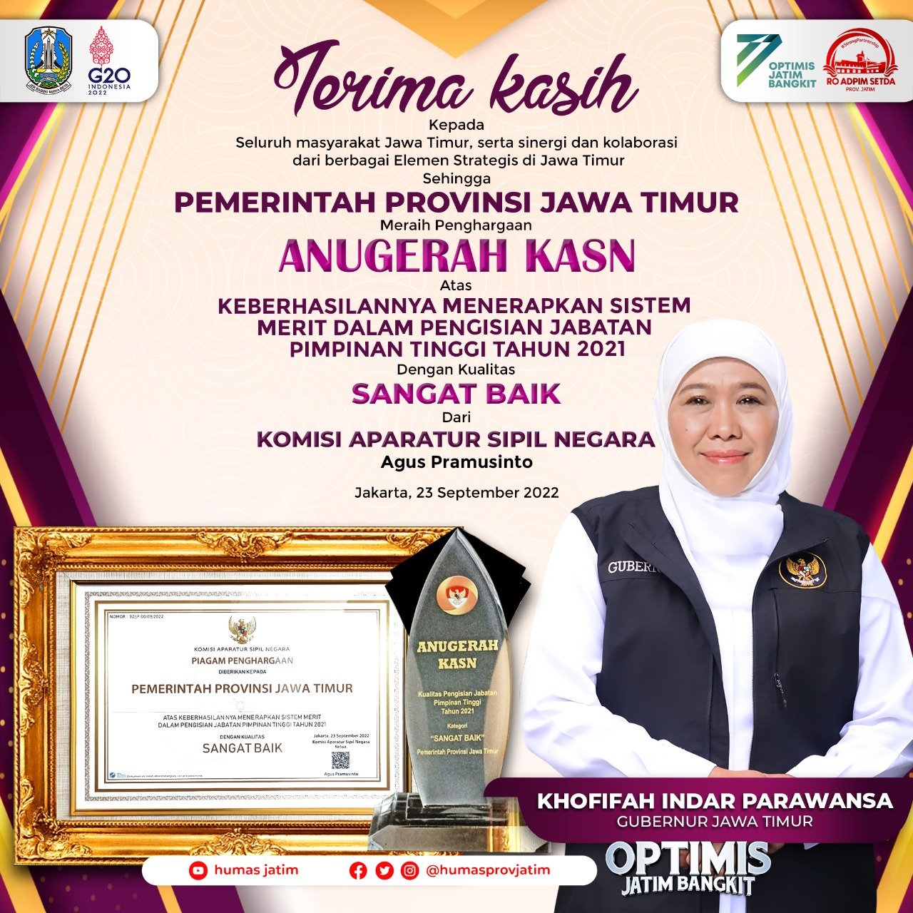 Pemprov Jatim mendapat penghargaan sebagai provinsi yang menerapkan sistem merit dengan ‘Kualitas Sangat Baik’ dalam pengisian JPT tahun 2021, dan memperoleh penilaian penerapan sistem merit tertinggi se-Indonesia.