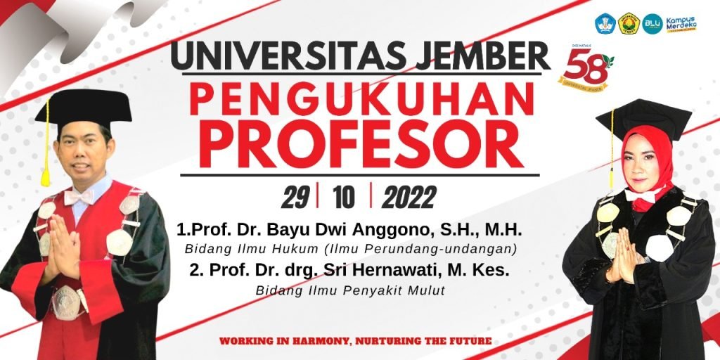 SURABAYAONLINE.CO – Universitas Jember (UNEJ) bakal kembali menggelar upacara pengukuhkan guru besar. Kali ini guru besar yang akan dikukuhkan adalah Prof. Dr. Bayu Dwi Anggono, SH., MH., guru besar Ilmu Perundang-Undangan dari Fakultas Hukum. Kedua, Prof. Dr. drg. Sri Hernawati, M.Kes., guru besar Ilmu Penyakit Mulut di Fakultas Kedokteran Gigi.