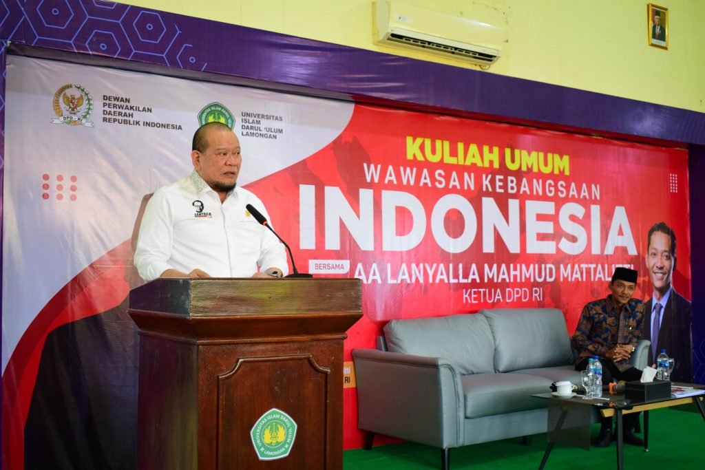LAMONGAN, Surabayaonline-La Nyalla Mattalitti ketua Dewan Perwakilan Daerah Republik Indonesia (DPD RI) menghadiri kuliah umum wawasan kebangsaan Indonesia yang diselengarakan oleh Universitas Islam Darul `Ulum (Unisda) Lamongan di ruang Auditorium Gedung Rektorat Lantai 3 pada Selasa (20/12/22).