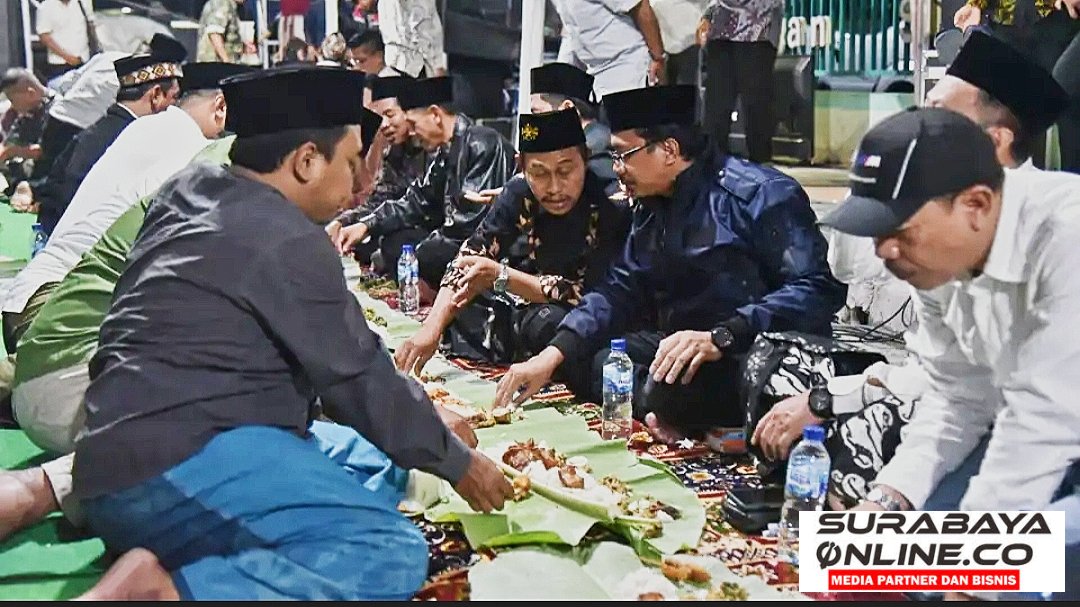 SURABAYAONLINE.CO, Sidoarjo – Menyambut malam pergantian Tahun Baru 2023, Bupati Sidoarjo Ahmad Muhdlor Ali merayakannya bersama ribuan warga dari lima desa di wilayah Kecamatan Tulangan. Selesai acara tasyakuran dan doa bersama selanjutnya makan bareng secara lesehan dengan beralaskan daun pisang.