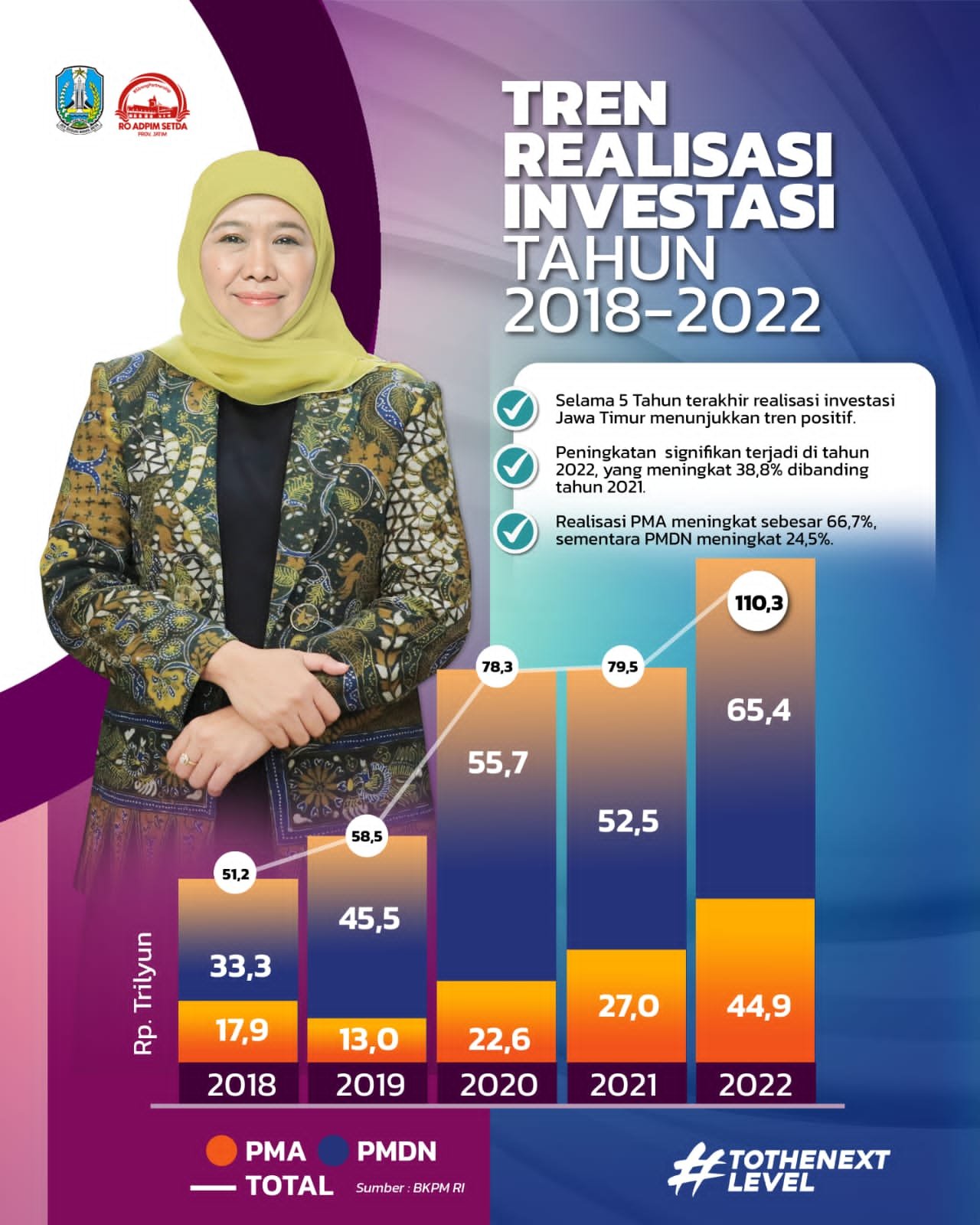 Realisasi investasi Jatim Tahun 2022 ini tercatat paling tinggi dalam lima tahun terakhir. Secara berturut – turut, realisasi tahun 2018 sebesar Rp 51,2 triliun, tahun 2019 sebesar Rp 58,5 triliun, tahun 2020 Rp 78,3 triliun, tahun 2021 Rp 79,5 triliun, dan tahun 2022 Rp 110,3 triliun.