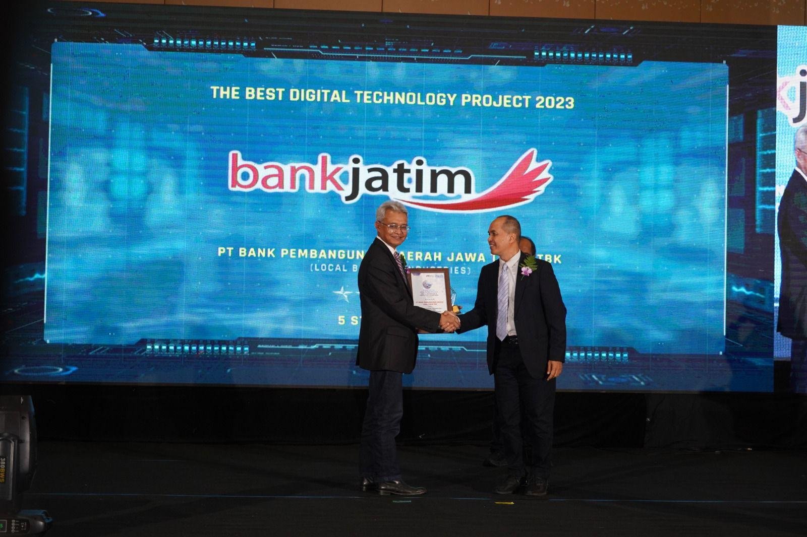 Direktur IT & Digital Bank Jatim Zulhelfi Abidin menerima penghargaan, Rabu (29/3) malam. Penghargaan yang berhasil diraih, yaitu The Best Digital Transformation (Local Banking Industries), The Best Digital Technology Project (Local Banking Industries), dan The Best Chief Information & Digital Officer Of The Year (Local Banking Industries).