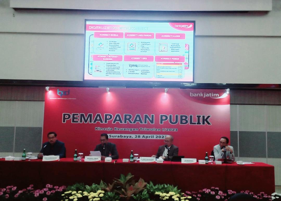 SURON.CO, Surabaya – PT Bank Pembangunan Daerah Jawa Timur Tbk atau Bank Jatim melaksanakan analyst meeting, memaparkan kinerja keuangan Triwulan I 2023. Acara ini dihadiri Direktur Utama Busrul Iman. Juga Direktur Keuangan, Treasury, & Global Services Edi Masrianto, serta Direktur Mikro, Ritel dan Menengah R. Arief Wicaksono.