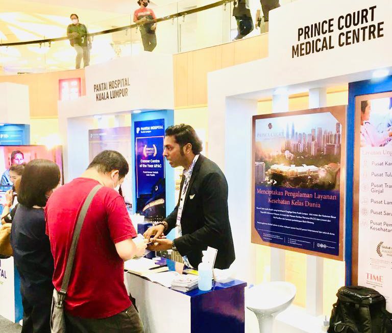Pengunjung Malaysia Healthcare Expo di Surabaya didorong untuk mengunjungi stan Prince Court Medical Centre untuk mempelajari lebih lanjut tentang layanan dan paket kesehatan mereka.