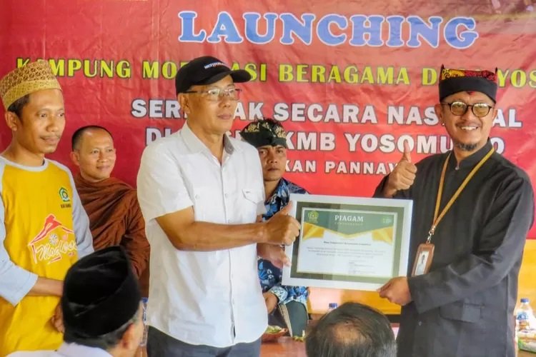 Amak menyerahkan piagam pengesahan Desa Yosomulyo sebagai KMB di Kabupaten Banyuwangi. “Di sini ada satu keluarga dengan 3 agama yang berbeda dan dapat hidup rukun,” kata Amak.