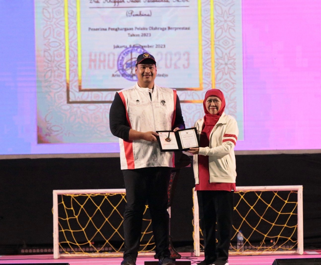 Dalam peringatan Haornas Jatim 2023, Gubernur Khofifah Indar Parawansa secara khusus juga menerima penghargaan sebagai Pelaku Olahraga Berprestasi 2023 kategori Pembina dari Menpora RI.