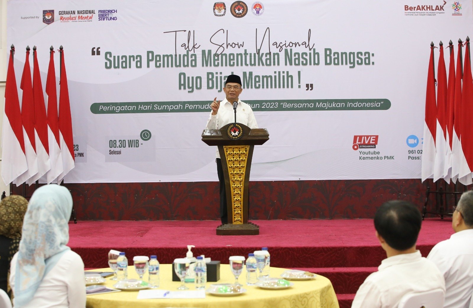 Kegiatan talk show dihadiri oleh Menteri Pemuda dan Olahraga Dito Ariotedjo yang hadir secara daring, serta beberapa narasumber yang berkompeten di bidangnya, yaitu: Direktur Eksekutif The Indonesian Institut (TII) Adinda T. Muchtar, Presidium Masyarakat Anti Fitnah Indonesia (Mafindo) Anita A. Wahid, Inisiator Bijak Memilih Andhyta F. Utami, Ketua Komisi Disabilitas Indonesia Dante Rigmalia, serta penanggap Direktur Eksekutif Perludem Khoirunnisa Nur Agustyati, Direktur Eksekutif Puskapol UI Hurriyah. Menariknya acara ini dipandu, dimoderatori dan dihadiri oleh para pemuda dan organisasi kepemudaan baik secara luring dan daring.