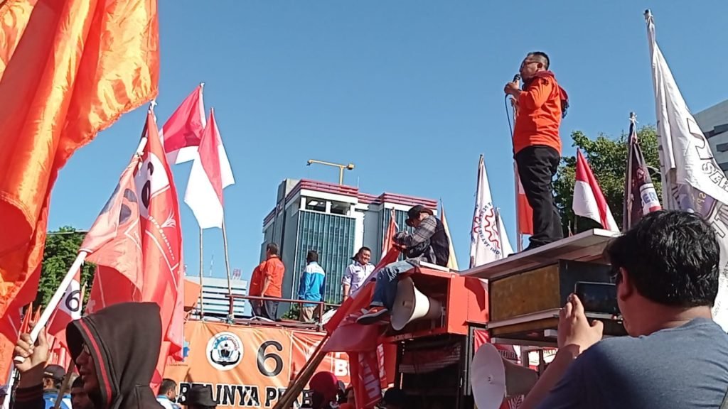 “Tetapi kawan-kawan, Permenaker Nomor 18 ini hanya kita nikmati satu tahun saja,” kata Korlap buruh dengan pengeras suara.