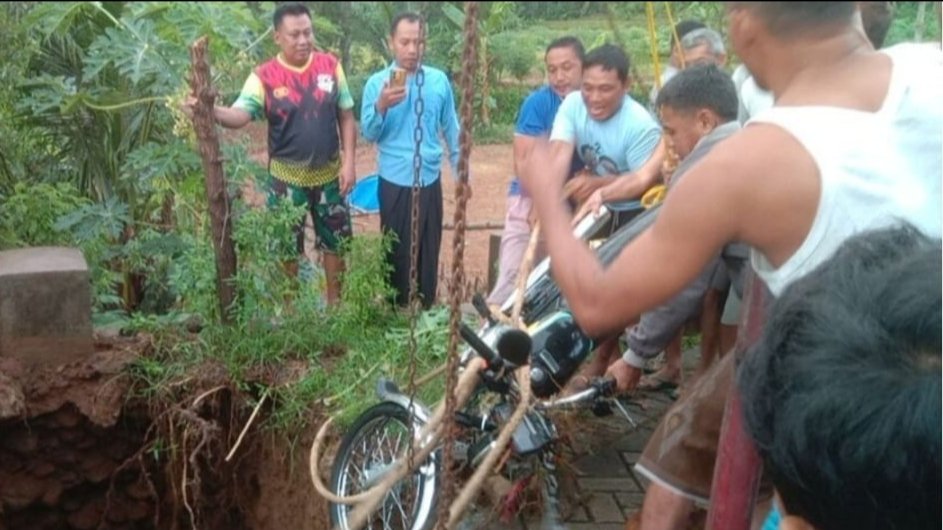 Evakuasi sepeda motor milik korban dilakukan aparat penanggulangan bencana bersama warga desa setempat. Menggunakan tangga dan tali, motor korban berhasil ditarik dan diamankan.